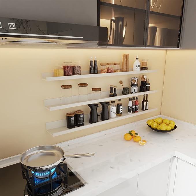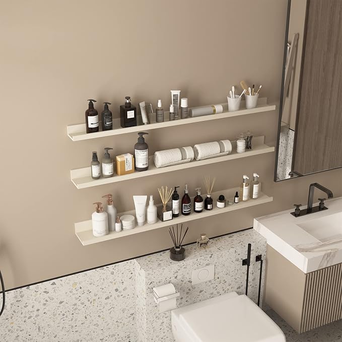 Giftgarden 47 Inch Floating Shelves for Wall Creamy White Beige Wood-Grain, Long Picture Ledge Large Wooden Photo Shelf for Living Room Bedroom Nursery Office, Set of 3 Different Sizes
