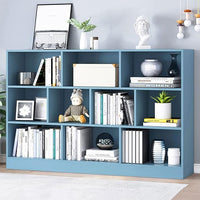 IOTXY Open Shelf Low Bookcase - Wooden 3-Tier Floor Standing Display Cabinet Organizer with Base, 10 Cubes Short Horizontal Bookshelf in Bright Blue