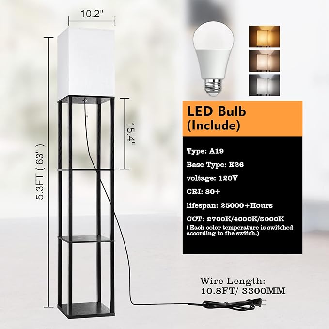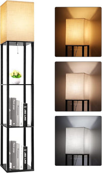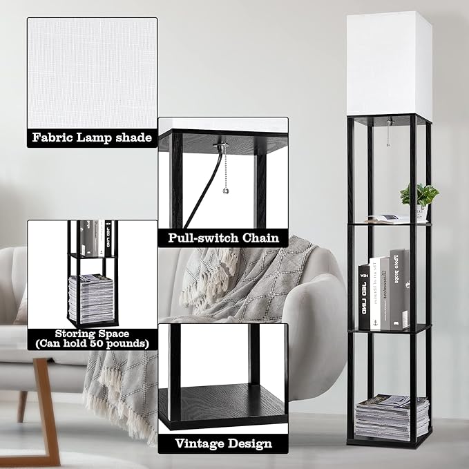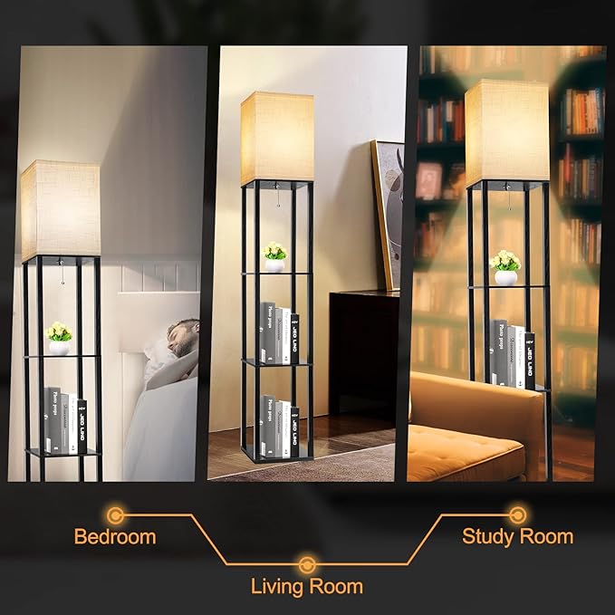 RUNTOP 3-Shelf Floor Lamp with LED Bulbs - Modern Standing Display Shelf Lamp for Living Room, Bedroom and Office (Black)