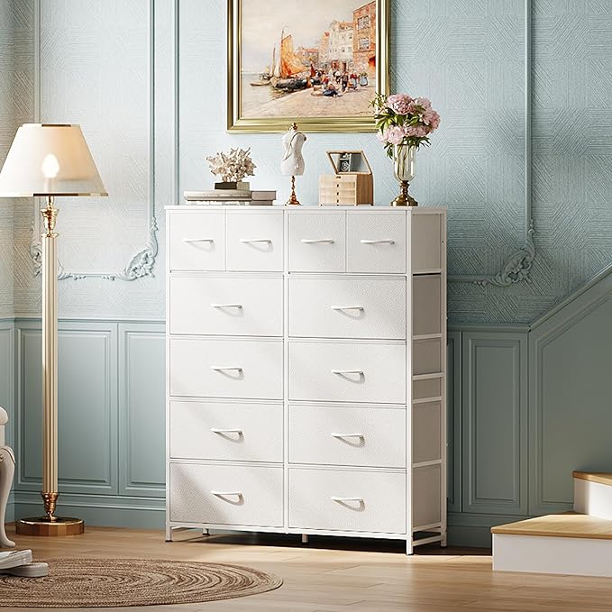 WLIVE Storage Organizer Unit with 12 Fabric Bins, Storage Drawers Organizer with Steel Frame, Tall Storage Tower Organizaton for Living Room, Hallway, Office, White Sale