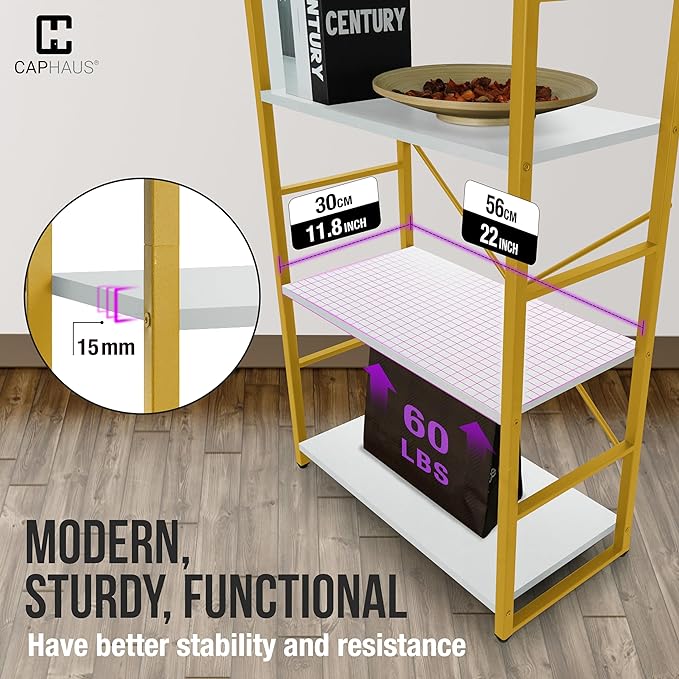 CAPHAUS 4 Tier Bookshelf, Bookcase Shelf Storage Organizer, Living Room, Kitchen, 24 Inch Width Free Standing Shelf, Industrial Book Shelves for Home Office, White Wooden Shelves & Gold Frame