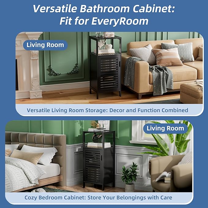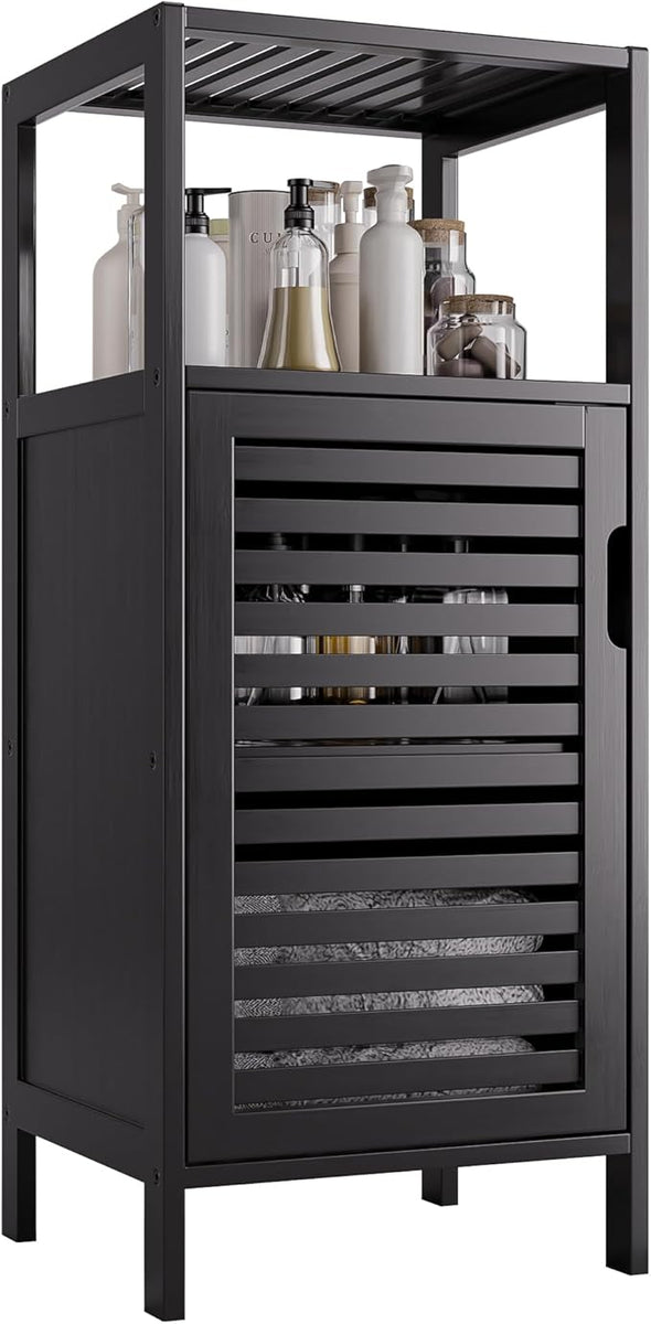 HITNET Bamboo Floor Cabinet, Small Bathroom Cabinet Floor Standing, 4 Tier Narrow Side Storage Cabinet, Space Saving Kitchen Cupboard with Single Door, Black
