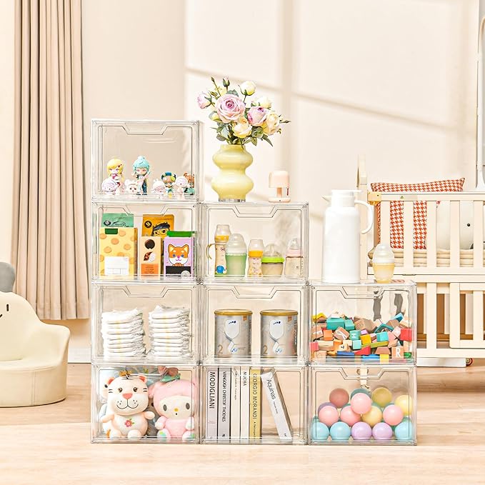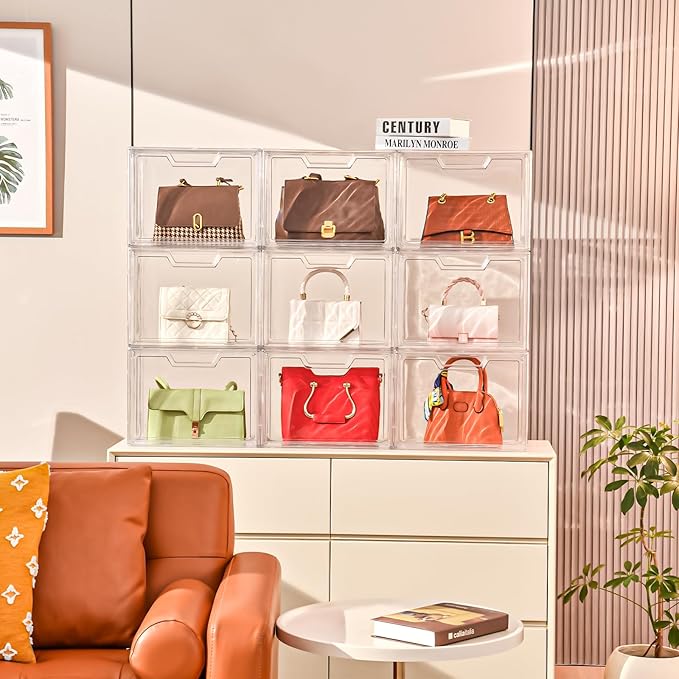 3 Pack Clear Storage Bins with Lids, Storage Containers with Magnetic Door, Stackable Acrylic Display Case for Handbags, Cosmetic, Multifunctional Storage Boxes for Dorm, Living Room, Bedroom Storage