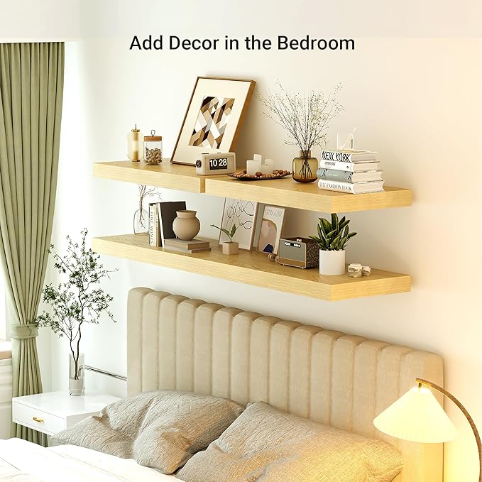 Heimlove 12" Deep Floating Shelves, 36 x 12 Inch Wall Mounted Long Floating Shelf with Invisible Brackets, for Home Decor, Bedroom, Kitchen, Living Room, Bathroom - 1 Pack, Oak