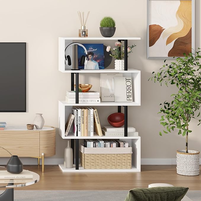 Yusong Geometric Bookcase, S Shaped Bookshelf 4-Tier Book Shelves for Bedroom, Modern Wood Decorative Display Shelf Tall Book Case for Home Office, Black and White