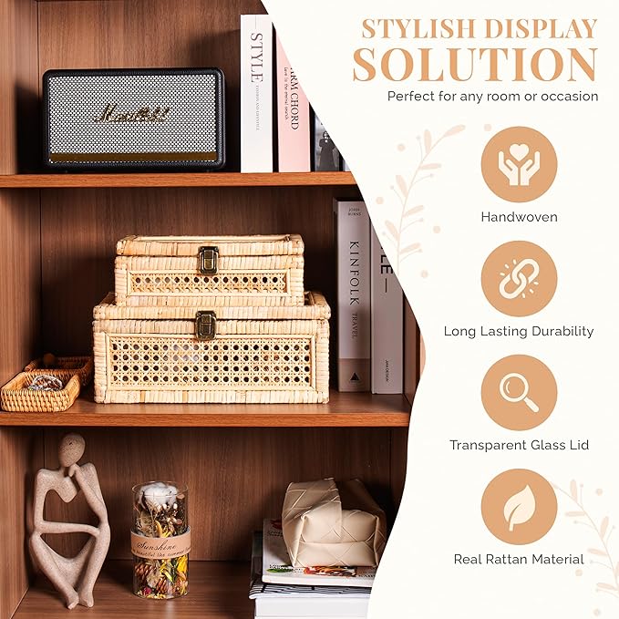 Rattan Display Boxes with Glass Lids - Rectangular Decorative Storage Box for Shelf - Set of 2 Woven Wicker Boho Cane Decor Organizers - 2 Removable Rattan Storage Trays