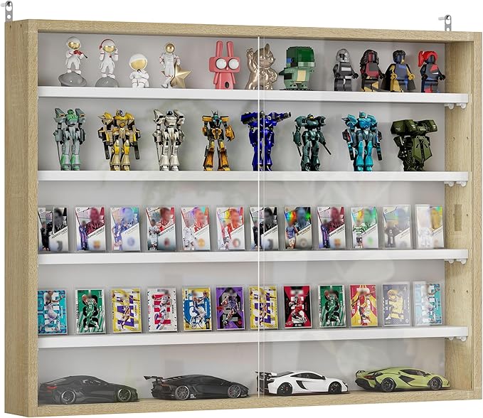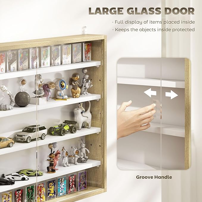 HOMCOM 5-Tier Display Cabinet, Glass Door Cabinet with Adjustable Shelves, Wall-Mounted Display Case for Playroom, Bedroom, Oak and White