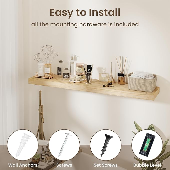 fuqing Floating Shelves for Wall - 48 Inch Natural Wood Shelves Set of 1-48W x 9.3D x 1.6H Wall Mounted Shelves with Upgraded Metal Brackets for Room Wall
