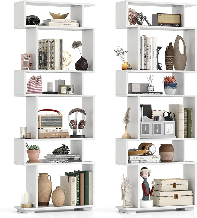 Tangkula 6-Tier S-Shaped Bookshelf, 64" Freestanding Geometric Bookcase, Home Office Wood Storage Shelf with Anti-Toppling Device, Room Divider Display Rack for Study, Living Room (2, White)