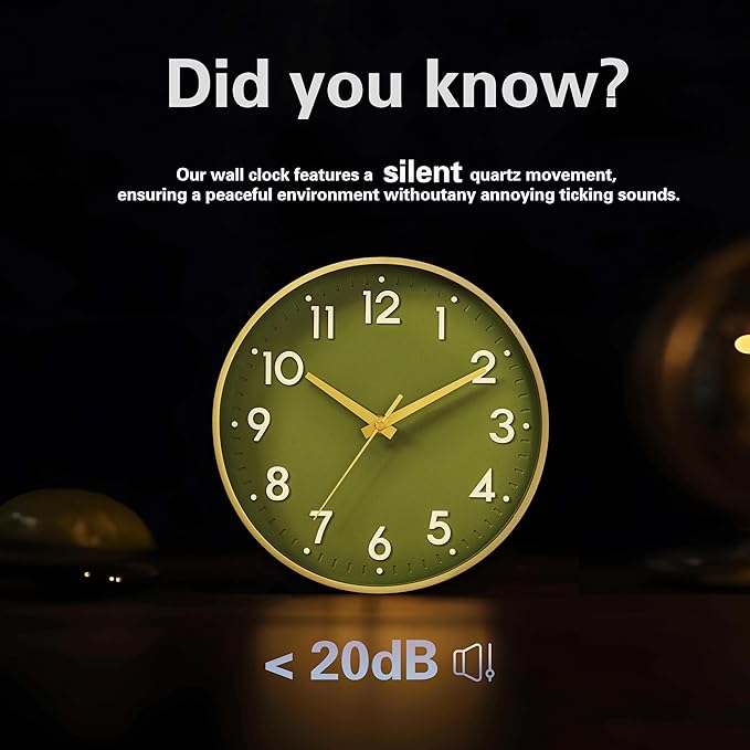 Mosewa Wall Clock 12 Inch, Battery Operated Non-Ticking Analog Clock Decorative for Kitchen, Bedroom, Office, Home(Gold)