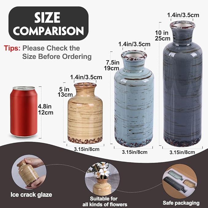 Ceramic Vase Set of 3, Small Flower Vases Home Decor, Modern Rustic Farmhouse Pottery Vases for Centerpieces, Living Room, Kitchen, Shelf, Bedroom, Bathroom, Fireplace, Table Shelf and Entryway Decor