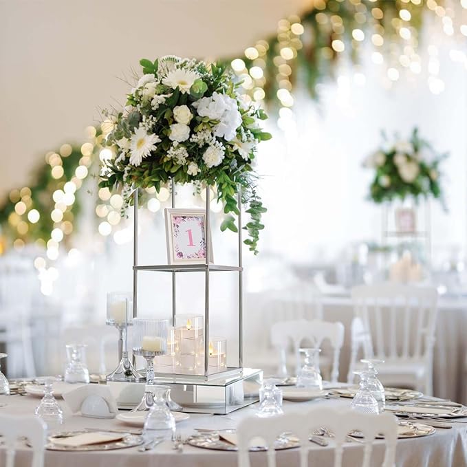 2-Tier Metal Flower Stand Set with Acrylic Shelves, Geometric Display Rack for Wedding Centerpieces, Party Decor, Tall Floor Vase Stand (Silver, 2 Pcs-25)
