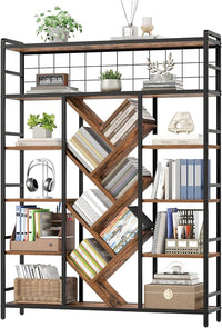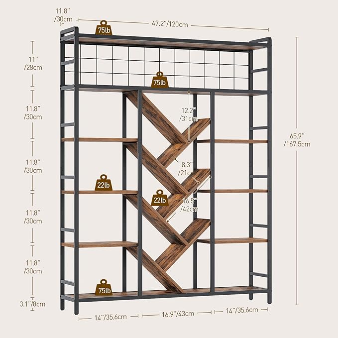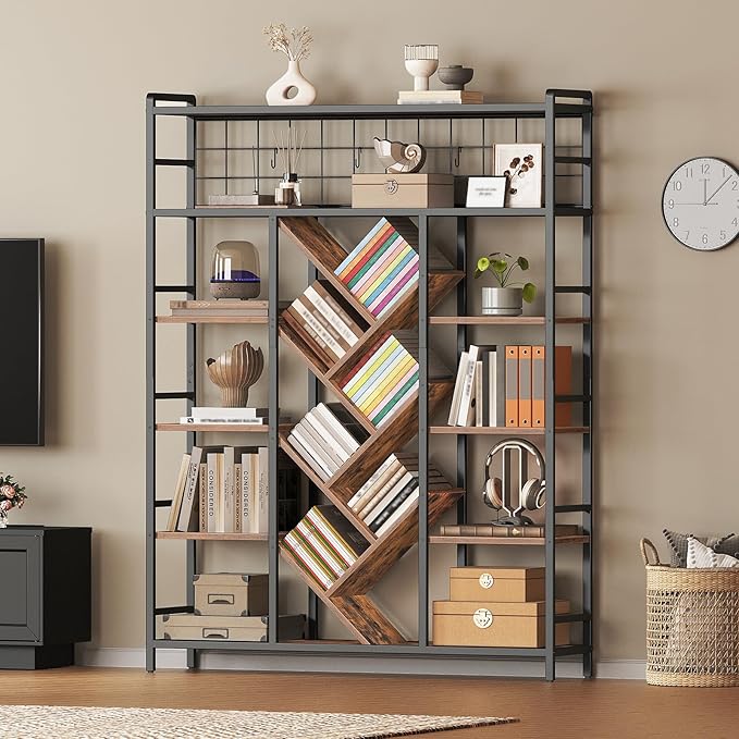 Triple 6-Tier Bookshelf, Industrial Large Bookcase with 18 Open Display Shelves, Modern Tree Bookcase with Metal Frame and Hanging Function for Living Room, Home Office, Rustic Brown and Black