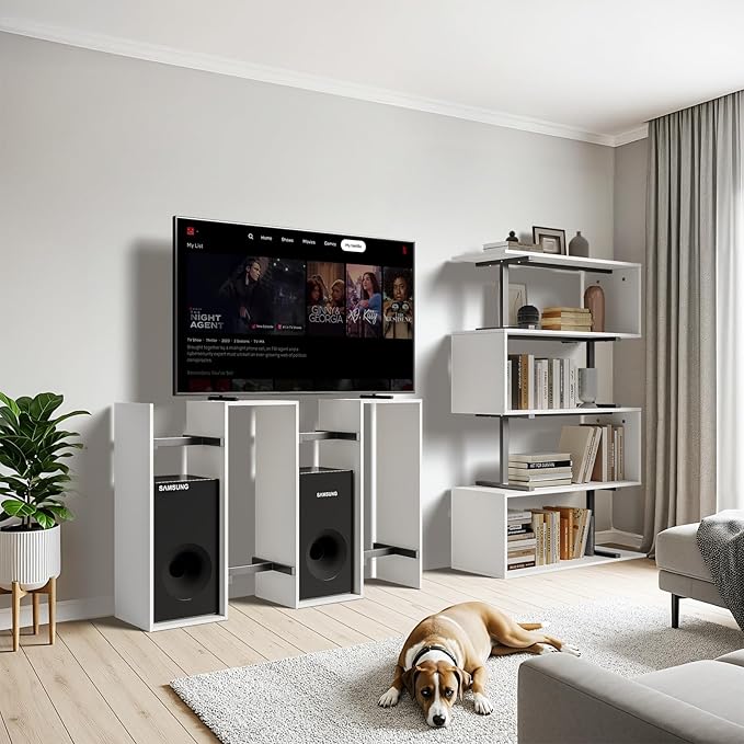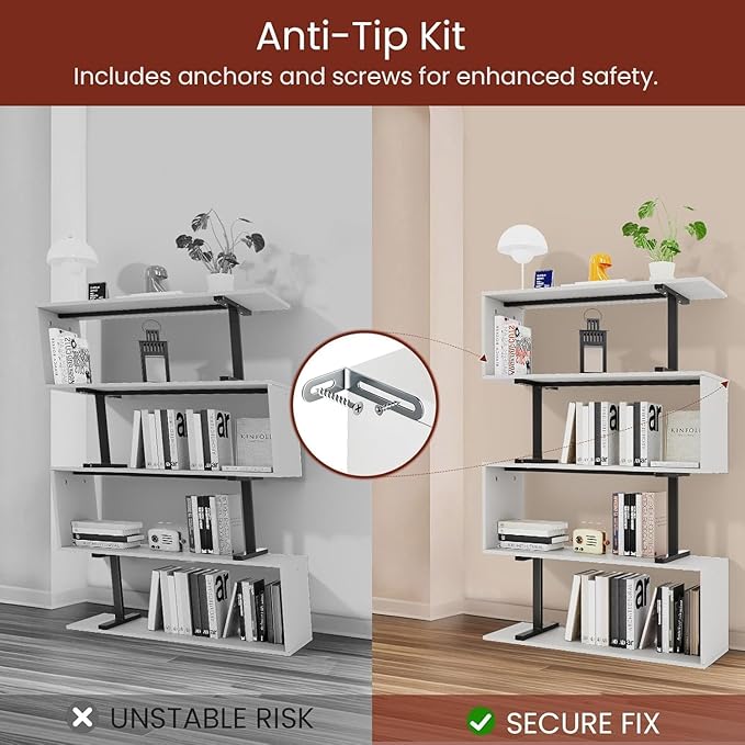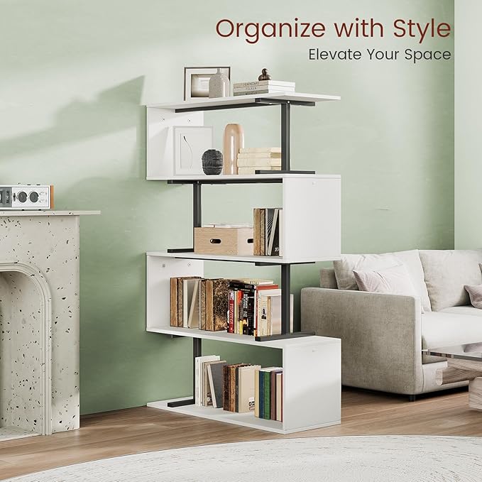 5-Tier Geometric Bookshelf, S Shaped Bookcase, 31.5" W x 58.3" H Wood Decorative Storage Shelving, Modern Freestanding Display Shelves, Tall Book Shelf Unit for Living Room Bedroom