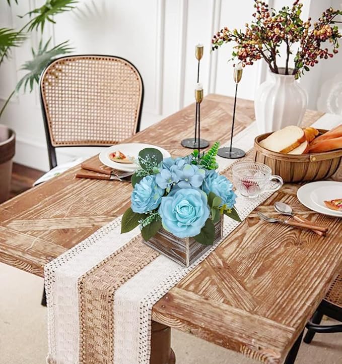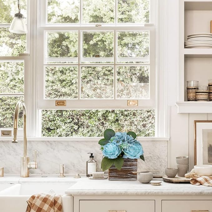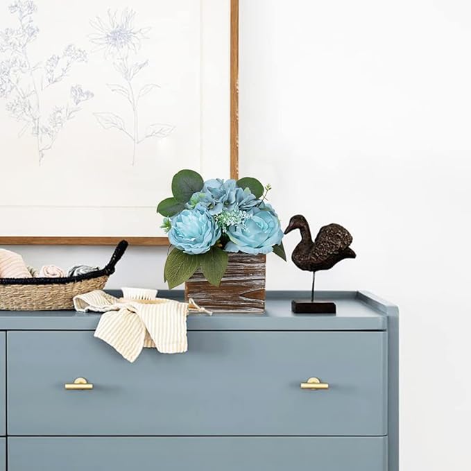 DILATATA Flower Arrangement with Wooden Vase 8" Artificial Flowers in Pot - Fake Flowers Roses Peonies Hydrangeas in Wooden Vase Potted Flower Centerpieces for Table Decor Living Room - Dusty Blue