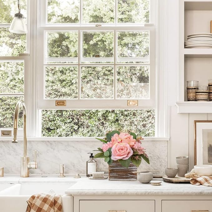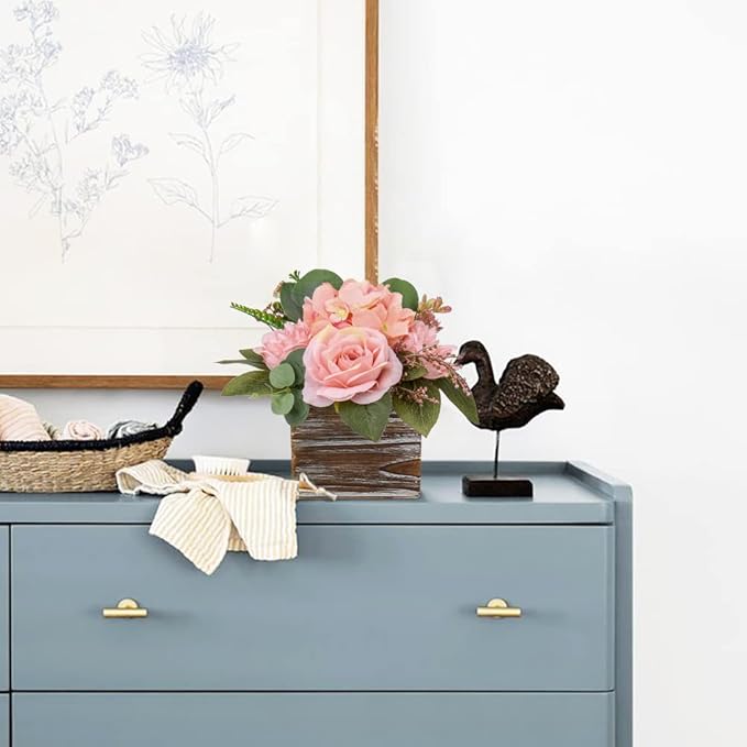 DILATATA Flower Arrangement with Wooden Vase 8" Artificial Flowers in Pot - Fake Flowers Roses Peonies Hydrangeas in Wooden Vase Potted Flower Centerpieces for Table Decor Living Room - Dusty Pink