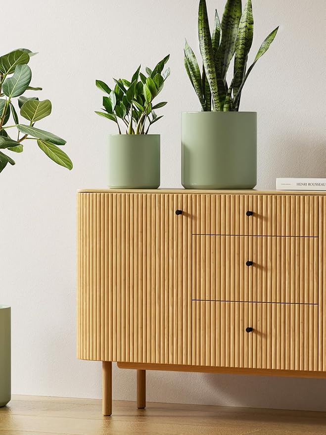 LE TAUCI Ceramic Plant Pots Indoor, 10+8+6 Inch Planters for Indoor Plants, Mid-Century Modern Pots with Drainage Hole and Plug, Cylinder Round Planters, Set of 3, Sage Green