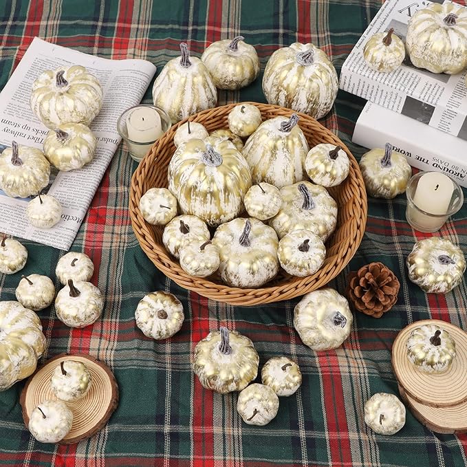 winemana 46 Pcs Assorted Size Artificial Pumpkins Fall Decorations, Gold Foam Pumpkin Autumn Decor, Decorative Faux Pumpkin for Halloween Thanksgiving Table Centerpiece Mantle Bowl Wedding Party