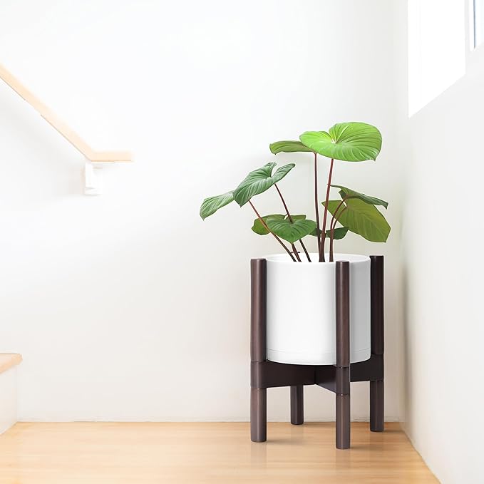 D'vine Dev Planter Pot with Stand - 8 Inch Plastic Cylinder Flower Pot with Wood Planter Holder for Indoor, Matte White Pot + Walnut Color Stand, 55-C-I-1