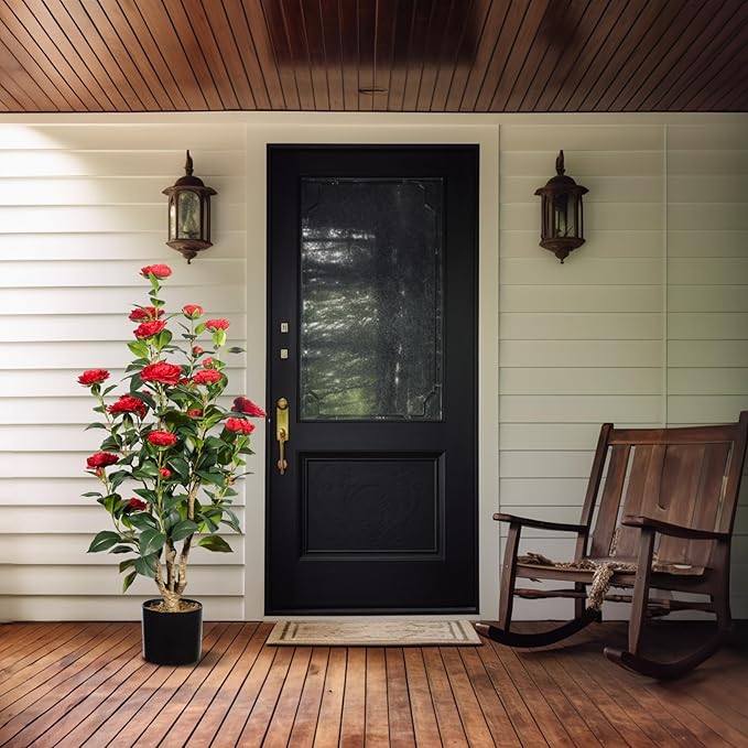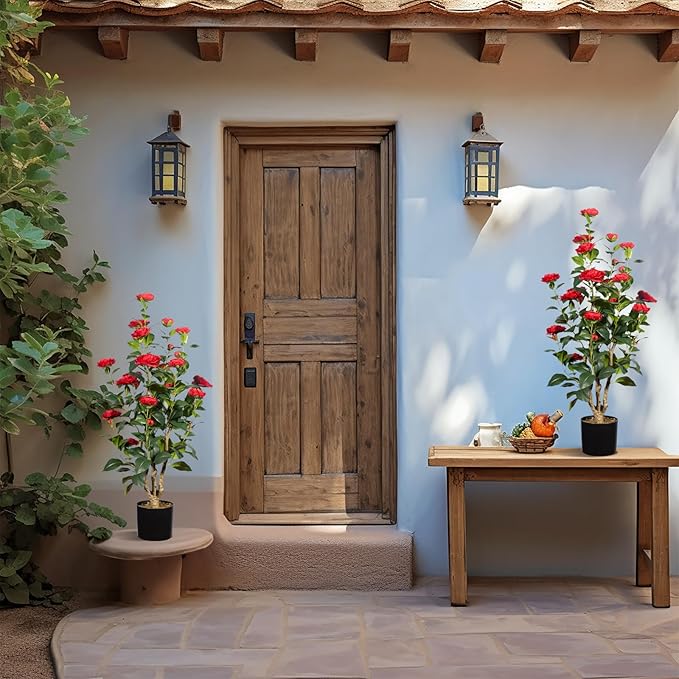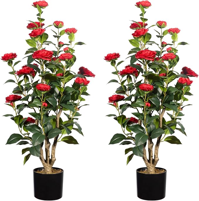 Romantic Season 2Pack Artificial Camellia Tree, 3FT, Red Faux Camellia Plant, Fake Potted Flower Tree for Modern Homes