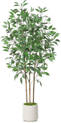 Ficus Artificial Tree 5ft Tall Fake Ficus Tree for Home Decor Indoor Faux Silk Ficus Plant Fake Floor Plant in White Imitation Ceramic Planter with Green Fake Moss, Set of 1