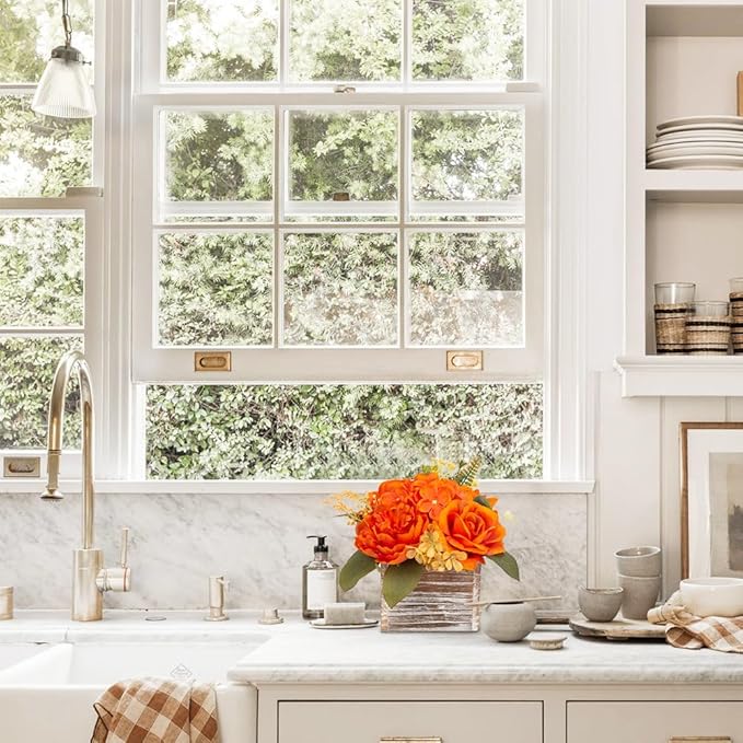 Flower Arrangement with Wooden Vase 8" Artificial Flowers in Pot - Fake Flowers Roses Peonies Hydrangeas in Wooden Vase Potted Artificial Flower Centerpieces for Table Decor Living Room - Burnt Orange