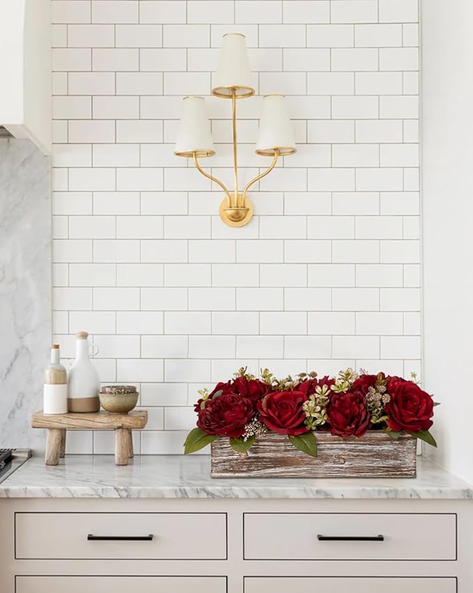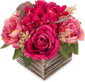 Flower Arrangement with Wooden Vase 14" Artificial Flowers in Pot - Fake Flowers Roses Peonies Hydrangeas in Wooden Vase Potted Artificial Flower Centerpieces for Table Decor Living Room - Red