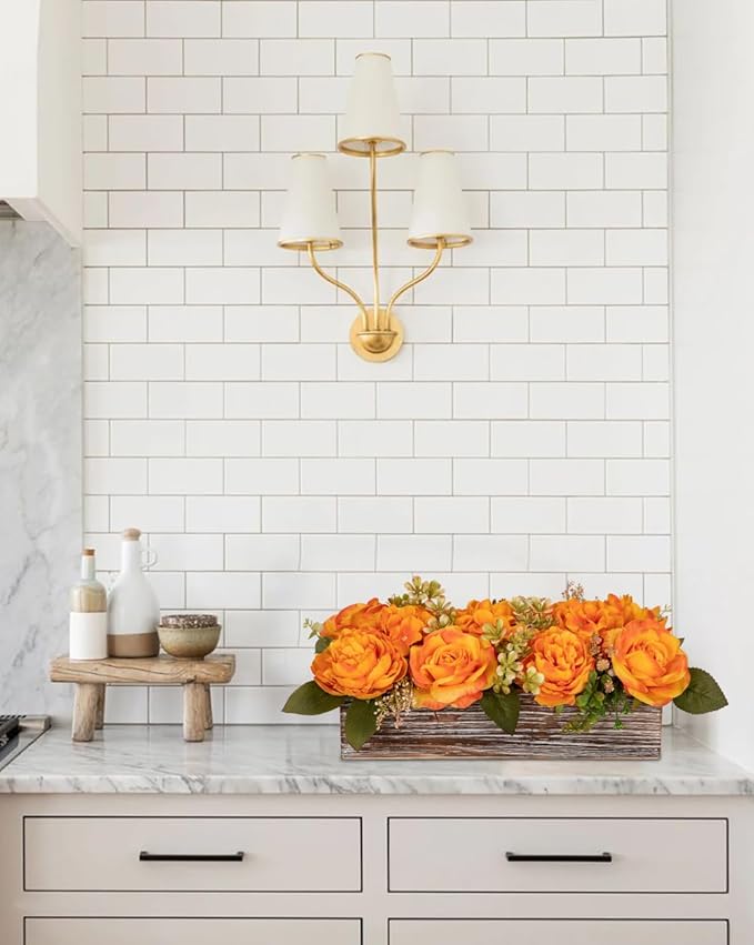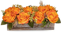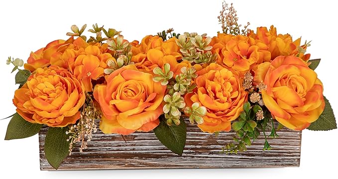 Flower Arrangement with Wooden Vase 14" Artificial Flowers in Pot - Fake Flowers Roses Peonies Hydrangeas in Wooden Vase Potted Artificial Flower Centerpieces for Table Decor Living Room - Orange