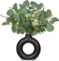 Artificial Eucalyptus Stems in Ceramic Vase 14.23" Fake Eucalyptus Plant Decor Black Donut Vase with Greenery Centerpiece Table Decorations Small Faux Green Plant for Home Farmhouse Wedding Table