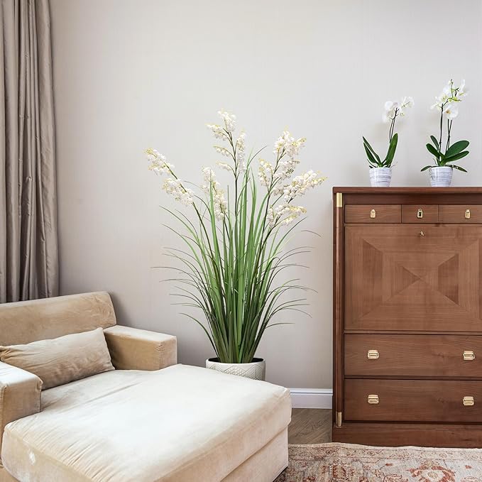 Artificial Tall Grass Plants with Pots 47“ 1 Pack Lily of The Valley Artificial Grass Home Interior Decorating and Outdoor Garden Decorations(White)