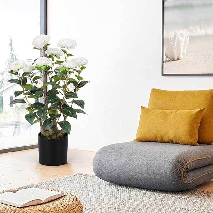 Romantic Season 2FT White Artificial Camellia Tree 2Pack, Faux Camellia Plant Fake Potted Camellia Flower Tree Plastic Camellia Tree for Modern Home Office Living Room Floor Décor