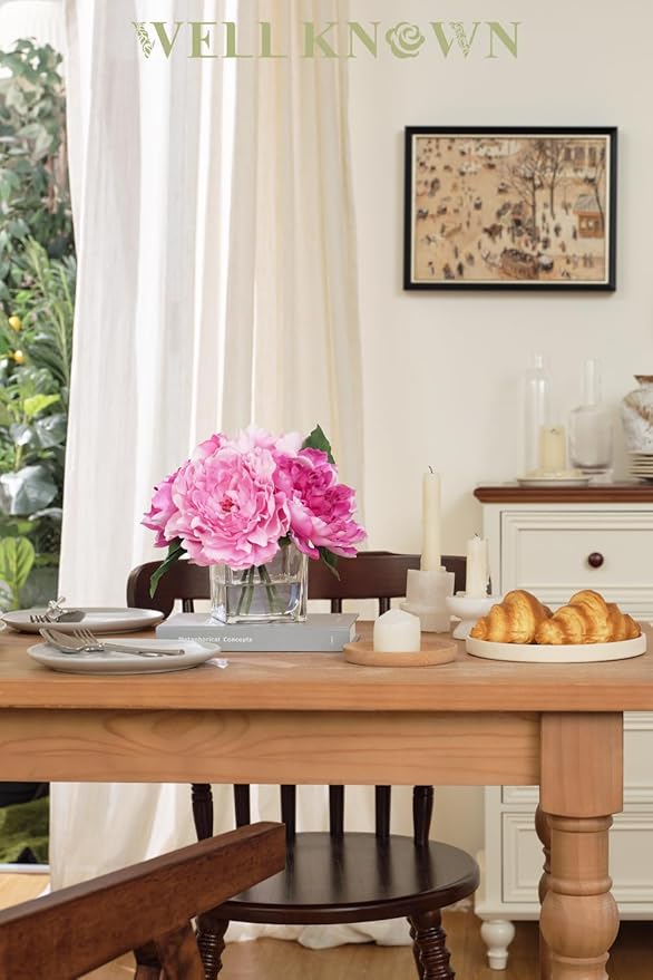 Artificial Peonies Flowers Arrangements in Cube Glass Vase, WELLKNOWN Silk Flower Centerpieces for Dining Room Table, Coffee Table Decor, Faux Peony Flowers with Faux Water (Bicolor Purple)