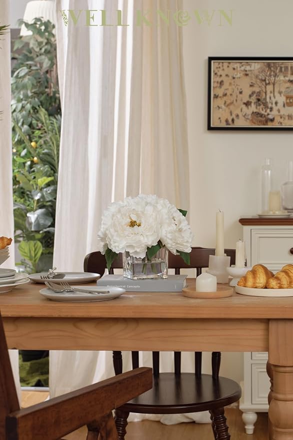 Artificial Peonies Flowers Arrangements in Cube Glass Vase, WELLKNOWN Ivory White Silk Flower Centerpieces for Dining Room Table, Coffee Table Decor, Faux Peony Flowers with Faux Water