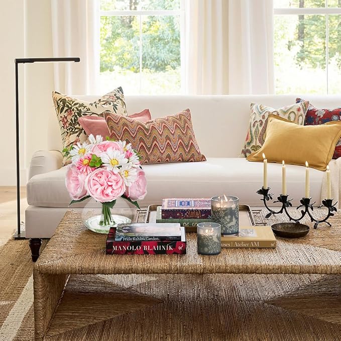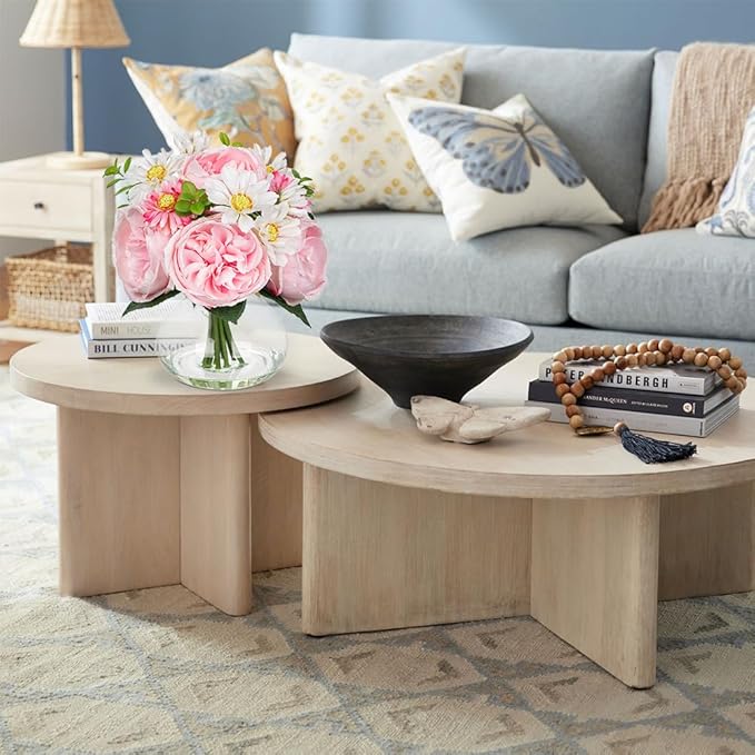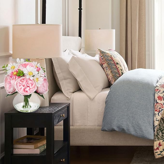 Hollyone Pink Roses Peonies Mums Artificial Flower Arrangement in Glass Vase White Silk Peony David Austin Rose Little Daisy Mixed Faux Flowers with Faux Water with Vase Fake Floral Bouquet Home Decor