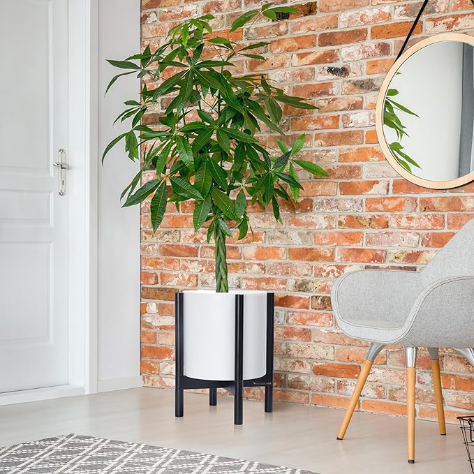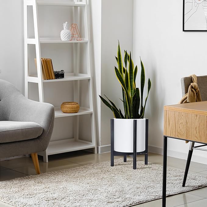 D'vine Dev Planter Pot with Stand - 12 Inch Plastic Cylinder Flower Pot with Wood Planter Holder for Indoor, Matte White Pot + Ebony Stand, 55-C-Q-1