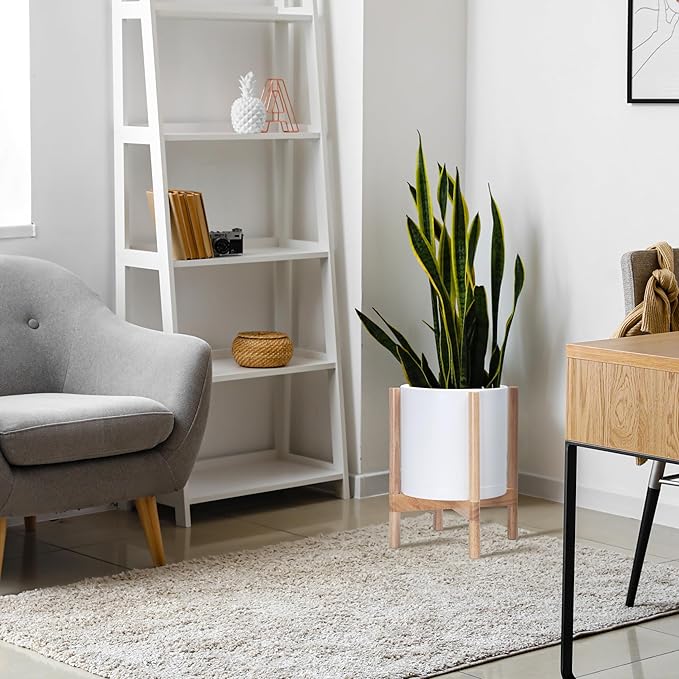 D'vine Dev Planter Pot with Stand - 12 Inch Plastic Cylinder Flower Pot with Wood Planter Holder for Indoor, Matte White Pot + Natural Stand, 55-C-P-1