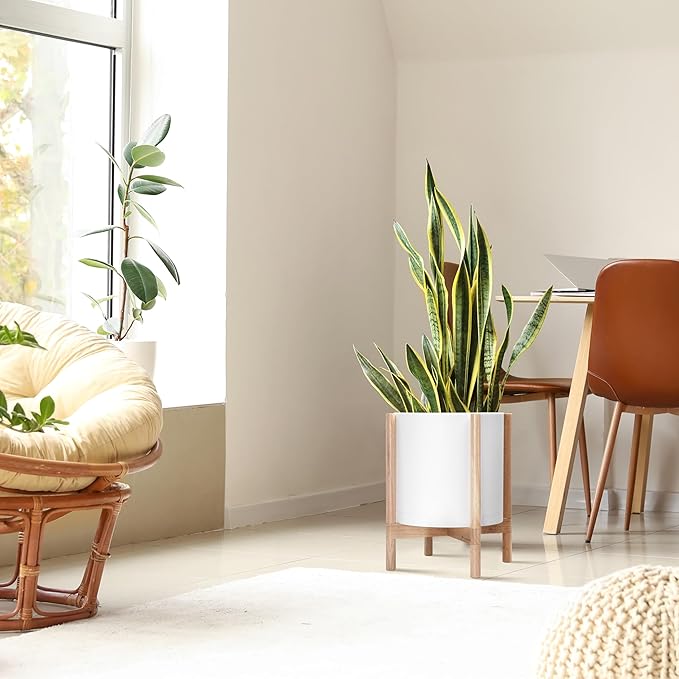 D'vine Dev Planter Pot with Stand - 14 Inch Plastic Cylinder Flower Pot with Wood Planter Holder for Indoor, Matte White Pot + Natural Stand, 55-C-S-1