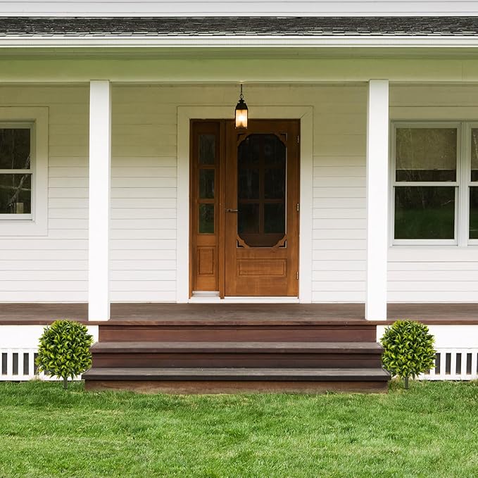 Fake Shrubs Outdoors UV Resistant Faux Plants Topiary Trees Set of 2-27.5'' Artificial Bushes Boxwood Balls Greenery with Ground Spikes for Front Porch, Fake Evergreen Plants Outdoor Decor