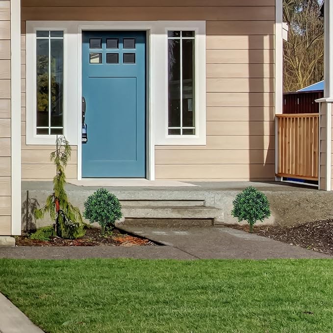 Set of 2 Fake bushes Artificial Shrubs for Outdoors Boxwood Balls Topiary Trees UV Resistant - 23.6'' Faux Plants with Ground Spikes for Spring Front Porch Decor, Fake Evergreen Tree for Garden