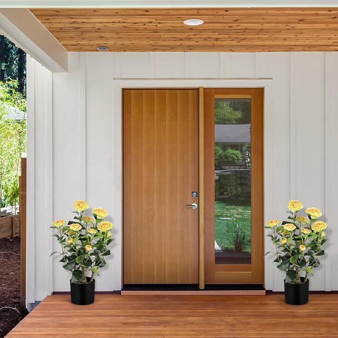Romantic Season 2FT Yellow Artificial Camellia Tree 2Pack, Faux Camellia Plant Fake Potted Camellia Flower Tree for Modern Home Office Living Room Floor Décor