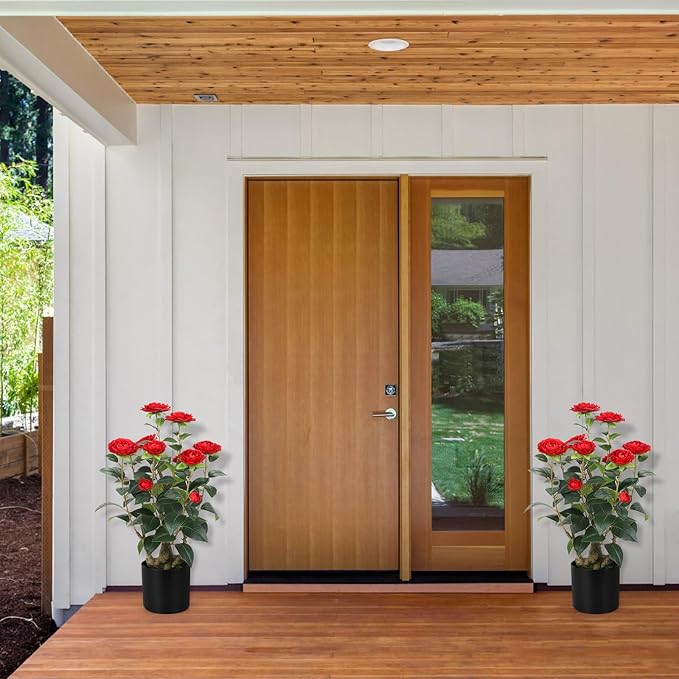 Romantic Season 2FT Red Artificial Camellia Tree 2Pack, Faux Camellia Plant Fake Potted Camellia Flower Tree for Modern Home Office Living Room Floor Décor