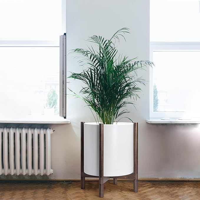 D'vine Dev Planter Pot with Stand - 16 Inch Plastic Cylinder Flower Pot with Wood Planter Holder for Indoor, Matte White Pot + Walnut Color Stand, 55-C-X-1 Sale