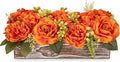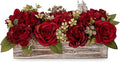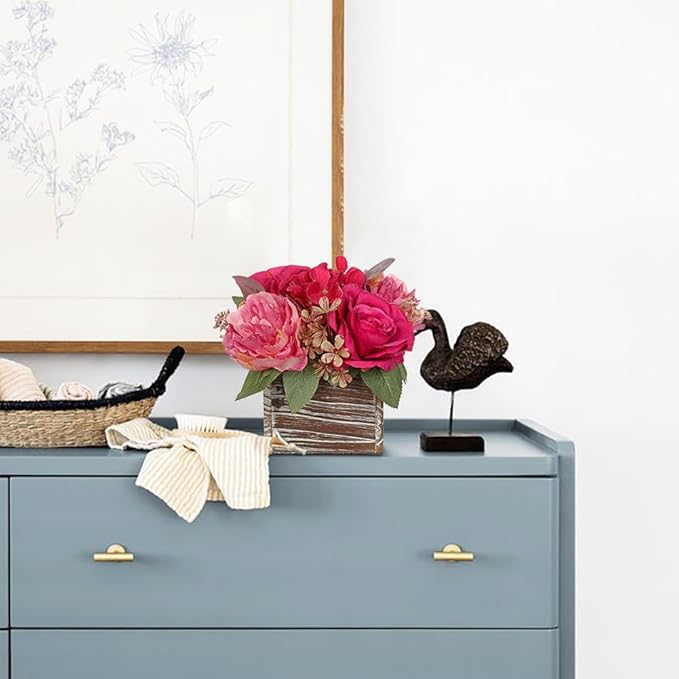 Flower Arrangement with Wooden Vase 8" Artificial Flowers in Pot - Fake Flowers Roses Peonies Hydrangeas in Wooden Vase Potted Artificial Flower Centerpieces for Table Decor Living Room - Hot Pink