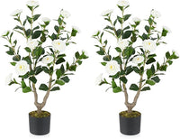 Goplus 36’’ Artificial Camellia Tree, 2 Pack Flower Plants Artificial Tree, Faux Floral Plant Blooming Tree in Nursery Pot, Greenery Potted Plant for Indoor Office Home Porch Decor, White