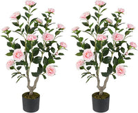 Goplus 36’’ Artificial Camellia Tree, 2 Pack Flower Plants Artificial Tree, Faux Floral Plant Blooming Tree in Nursery Pot, Greenery Potted Plant for Indoor Office Home Porch Decor, Pink