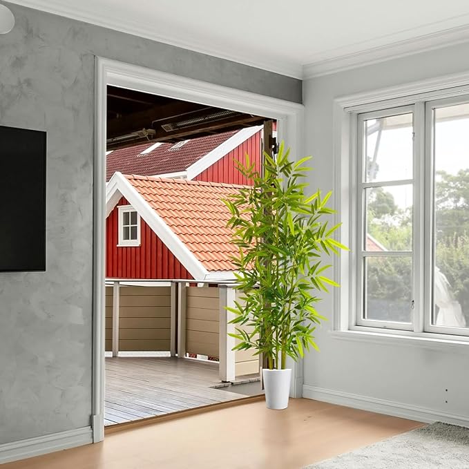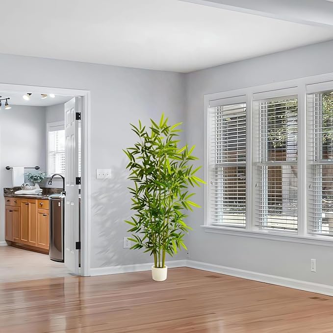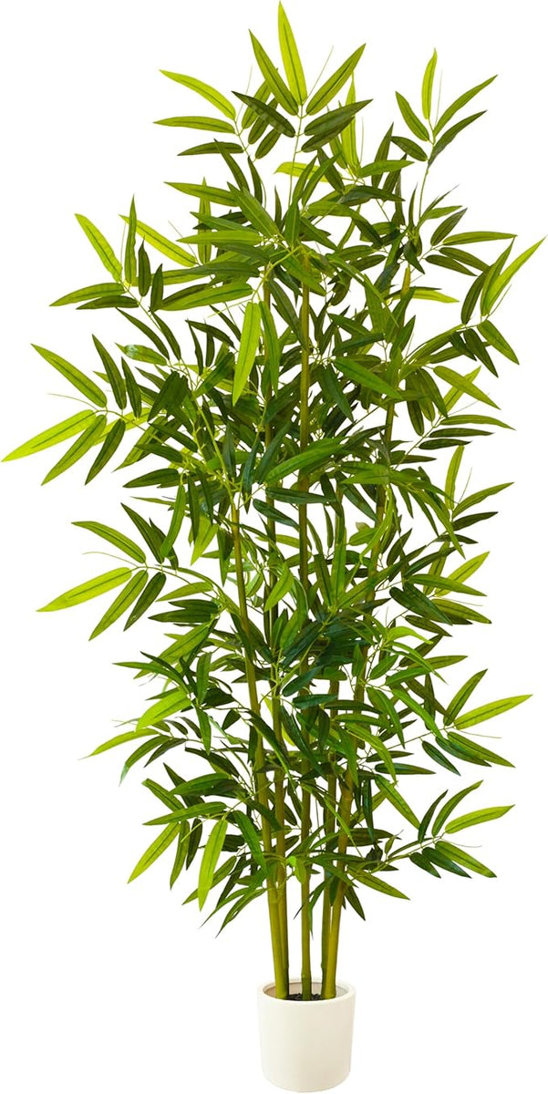 Artificial Bamboo Tree, 6ft Tall Fake Bamboo Plant with White Planter, Faux Trees with 5 Trunks and Lifelike Leaves for Indoor Outdoor Home Office Décor