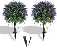 27.2" Artificial Lavender Topiary Set of 2 with Spike, Fake Plants Boxwood Balls Greenery Shrubs , Uv Resistant Artificial Push in Flowers Bushes for Outdoor Front Porch Decor, Home Faux Plants Indoor