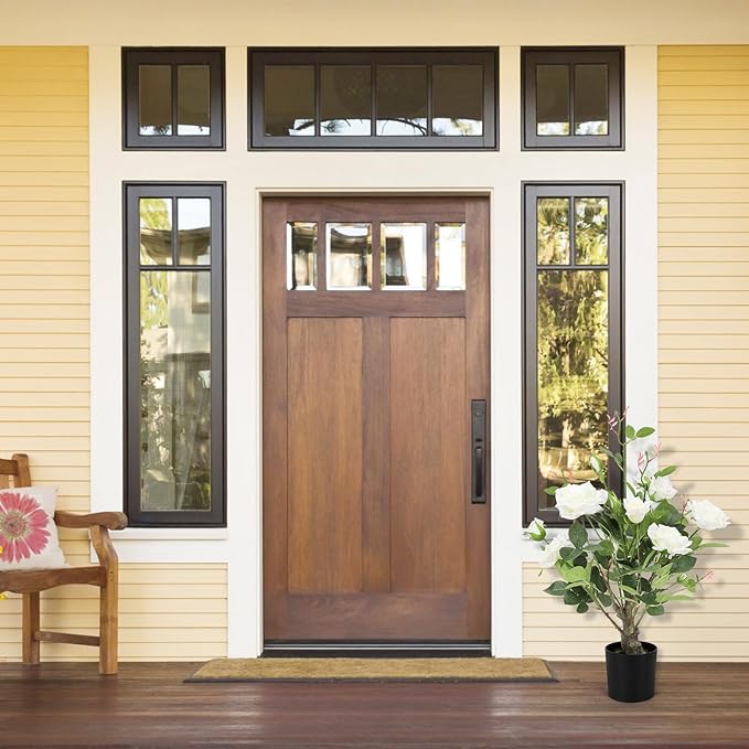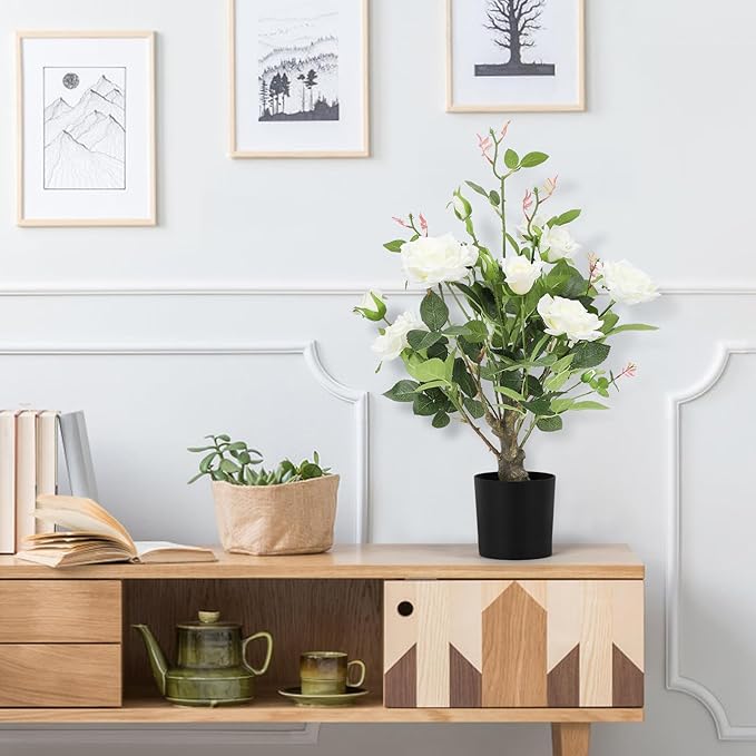 2Pack Artificial Rose Flower Trees, 24Inch White Faux Rose Tree with Green Leaves for Living Room Office Home Outdoor Indoor Decor,2FT White
