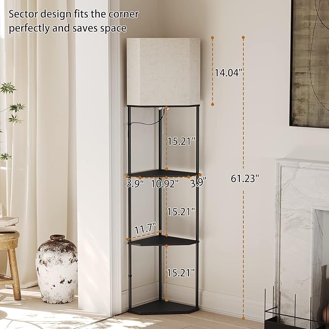 SUNMORY Sector Corner Shelf Lamp 3 Color Temperatures LED Bulb,Corner Lamps with Linen Lampshade, Floor Lamps for Living Room, Bedroom, Study, Black Standing Lamp with Shelves