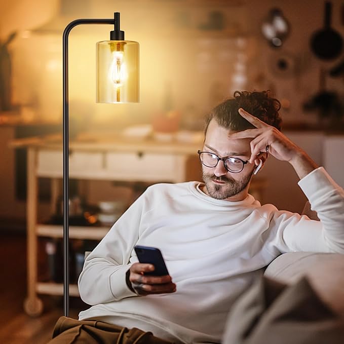 Floor Lamps for Living Room - Standing Lamp with Amber Glass Shade, Modern Floor Lamp with LED Bulbs, Industrial Floor Lamp for Bedroom, Black Tall Lamp for Office(Light Bulb Included)